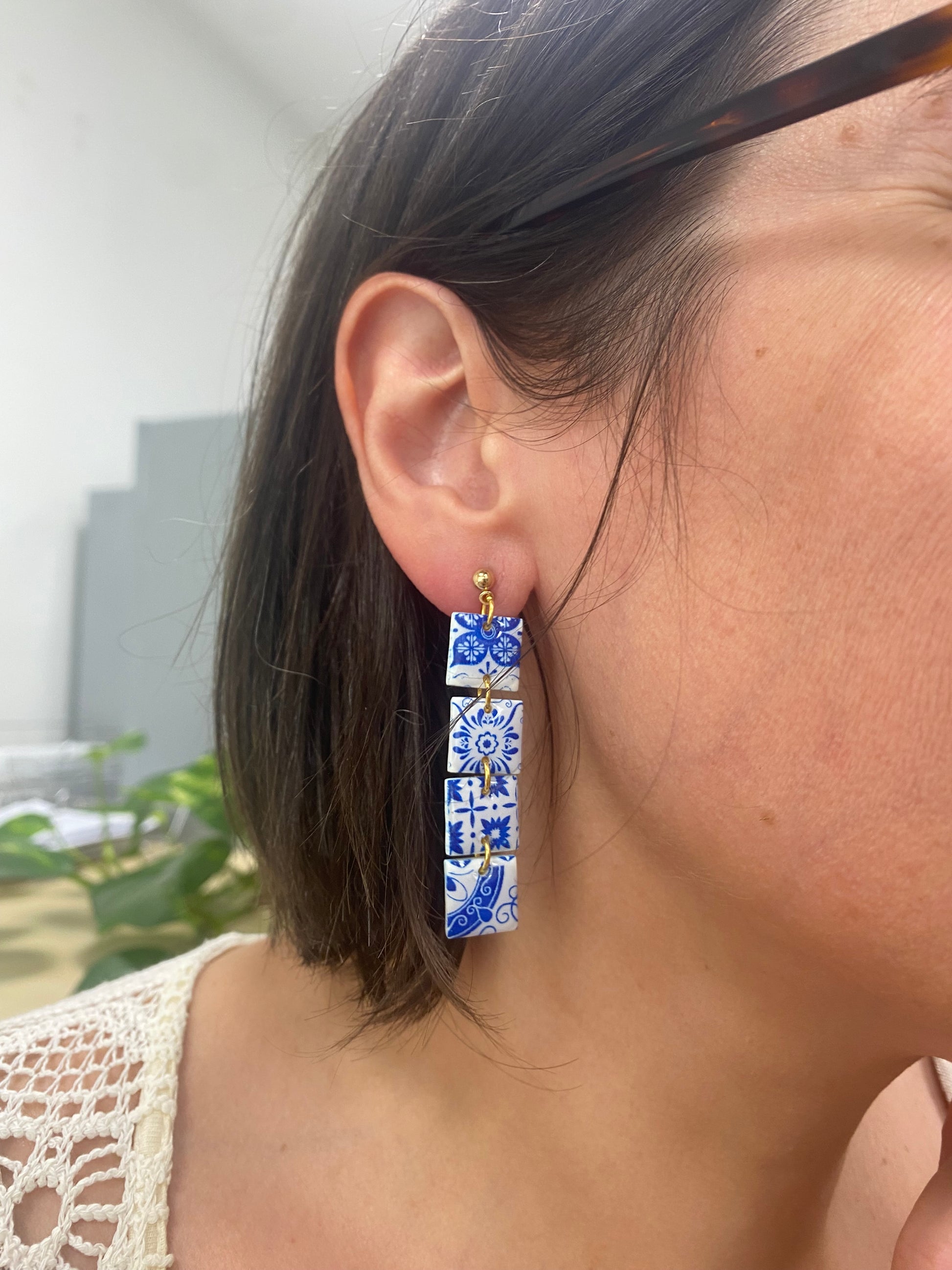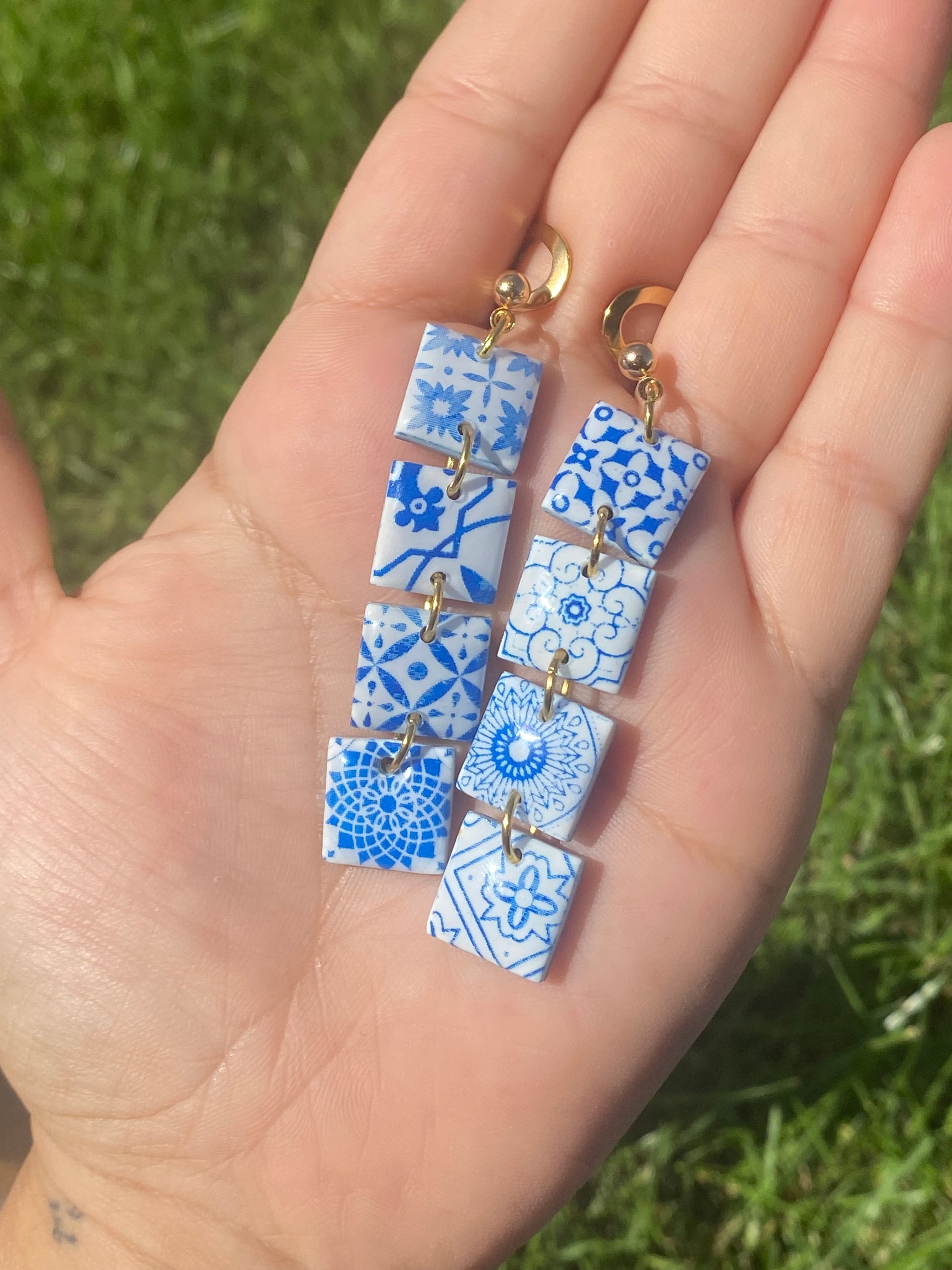 El patrón puede cambiar al tratarse de piezas únicas y hechas a mano. El estilo azulejo talaverano es único, de pende de que parte de la plancha se corte, así será tu pendiente.